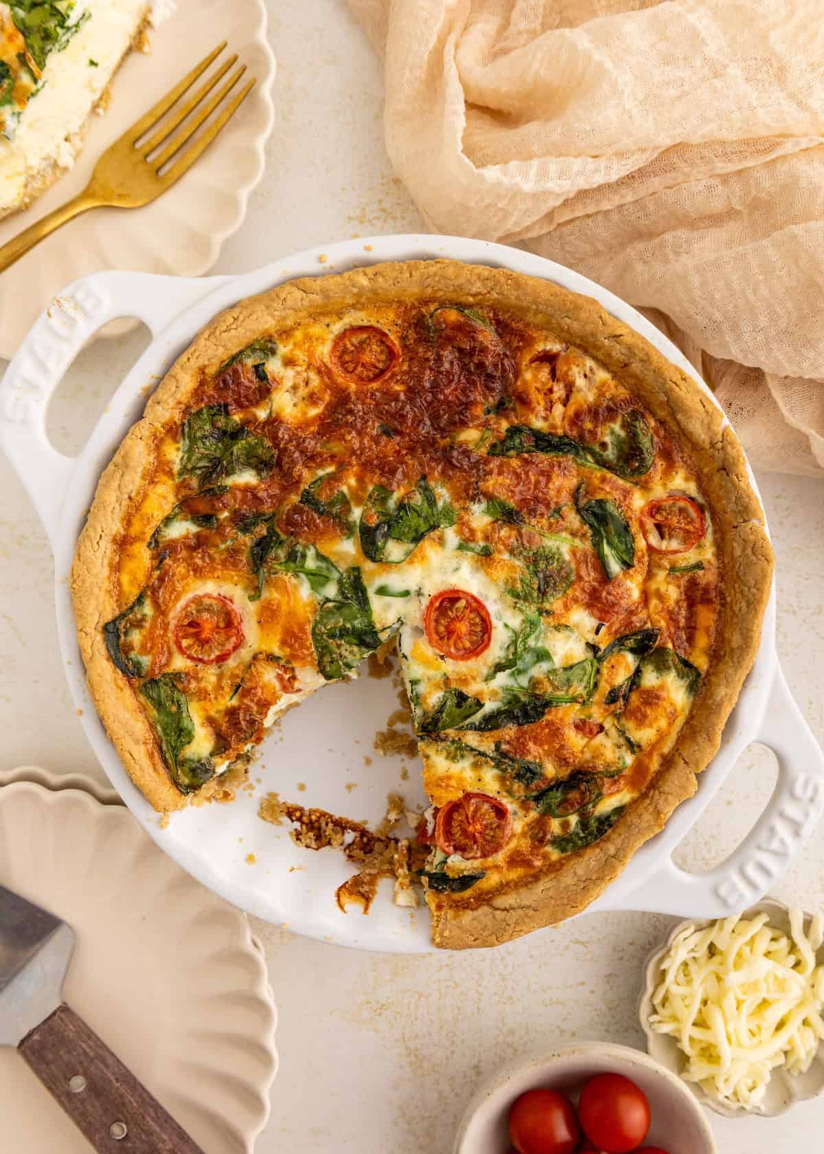 Egg white quiche is a lighter take on classic quiche that still feels filling and satisfying. It bakes up soft and fluffy with a savory garlic base, spinach, tomatoes, and melty mozzarella in every slice.