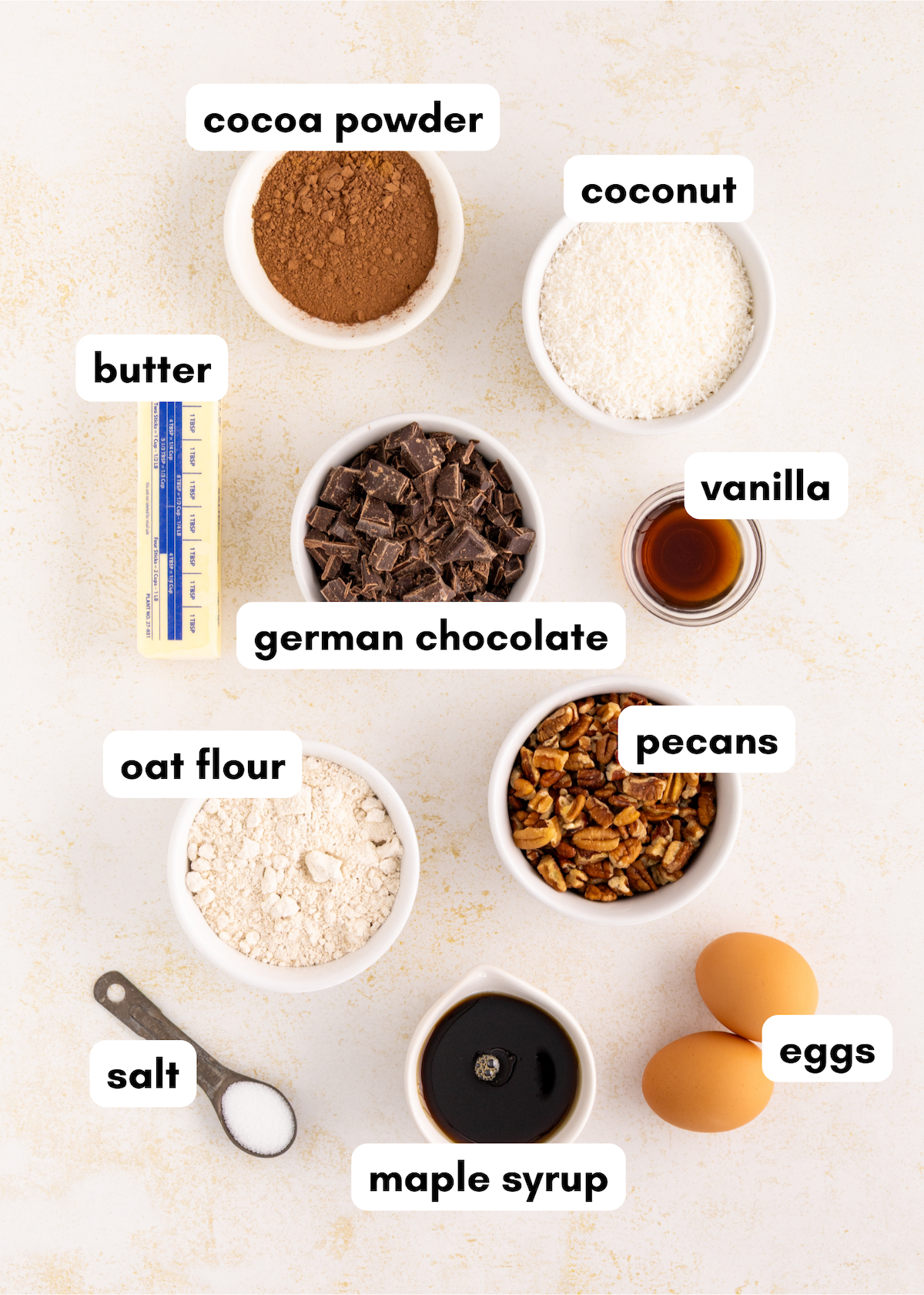 🥣 Main Ingredients: German chocolate, oat flour, maple syrup, coconut, pecans