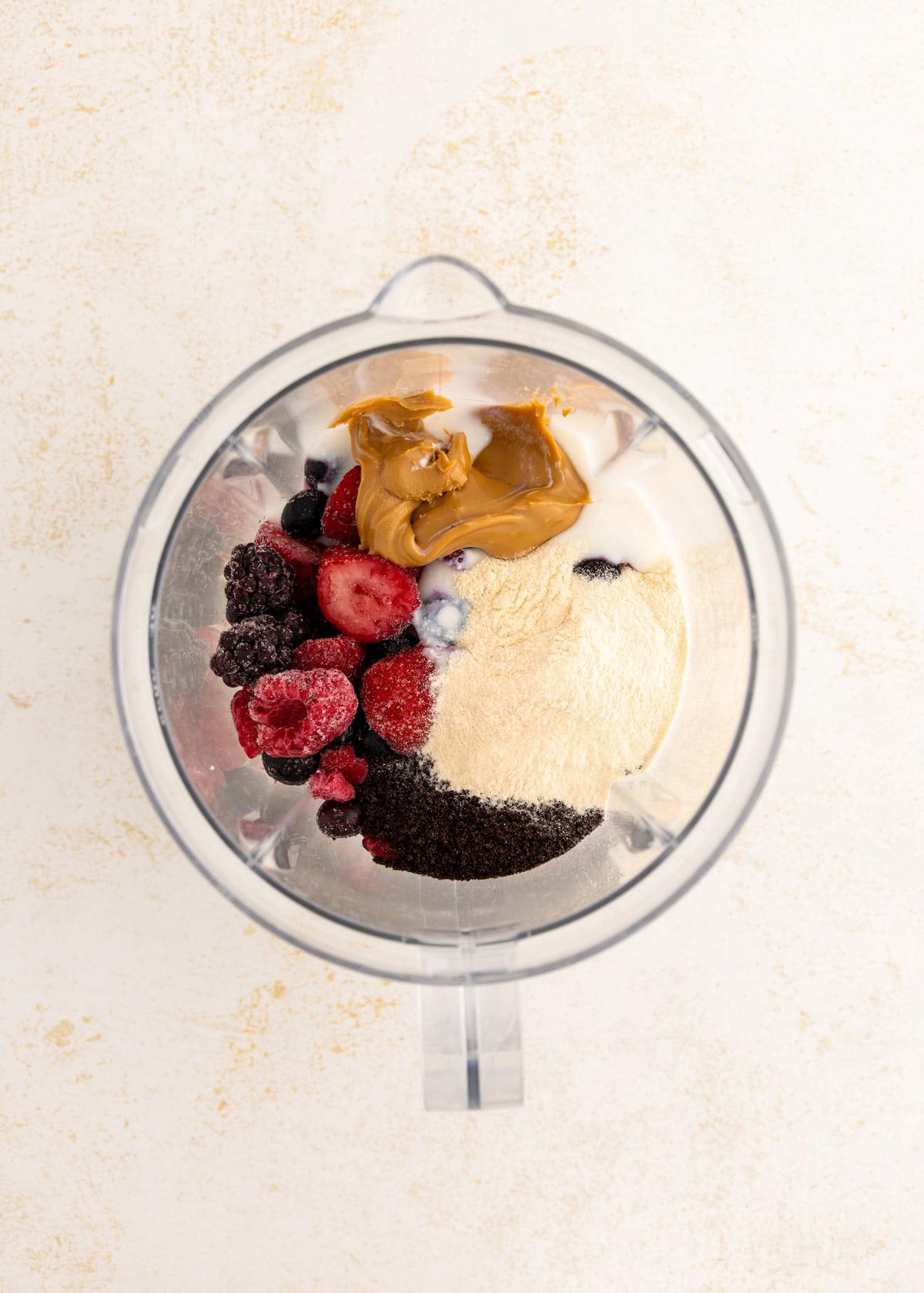 - Add milk, Greek yogurt, protein powder, almond butter, and açaí powder to a blender, then add the frozen mixed berries on top.