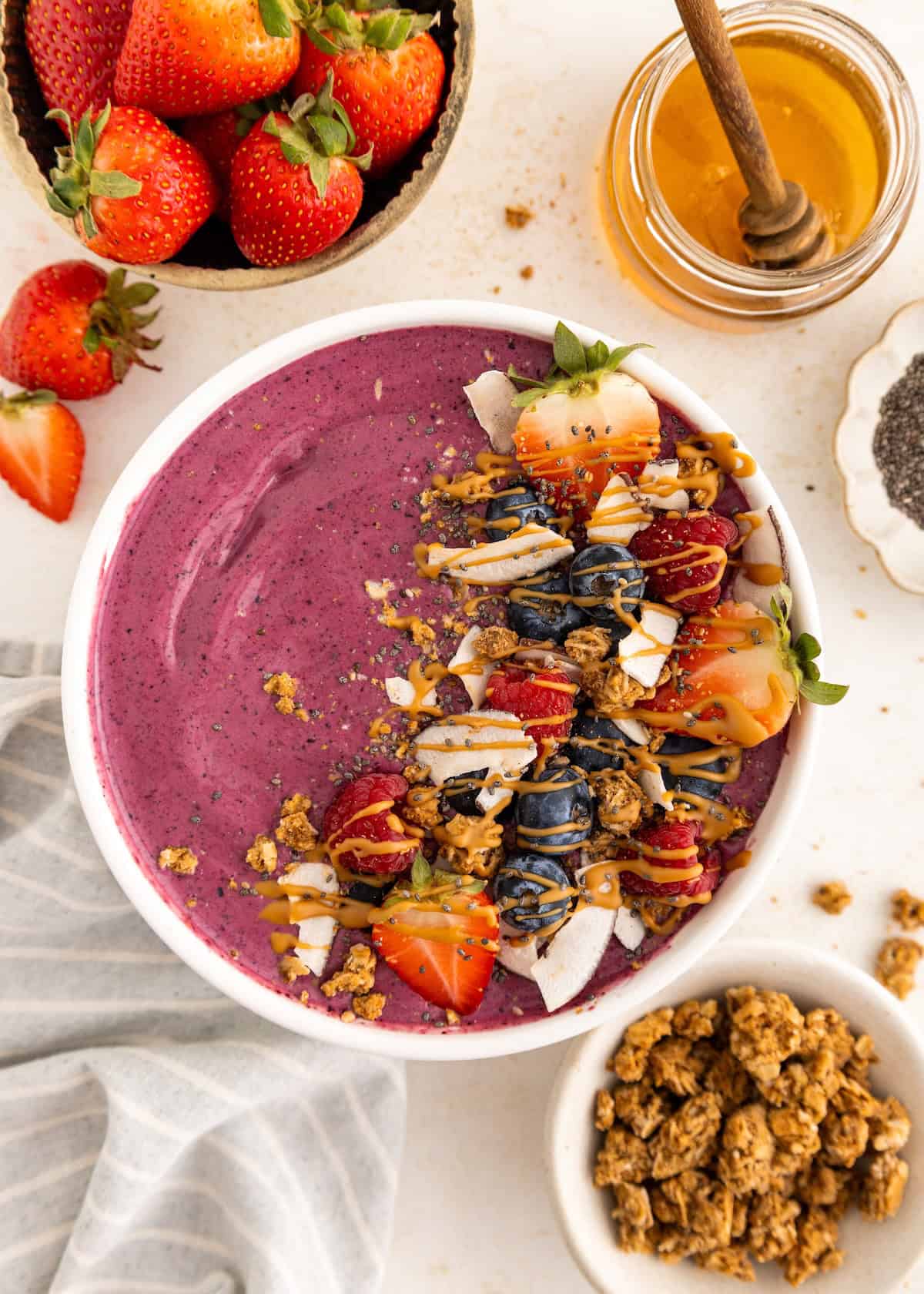 - frozen mixed berries. Keep the bowl thick and cold and give it that classic açaí bowl texture without using banana.