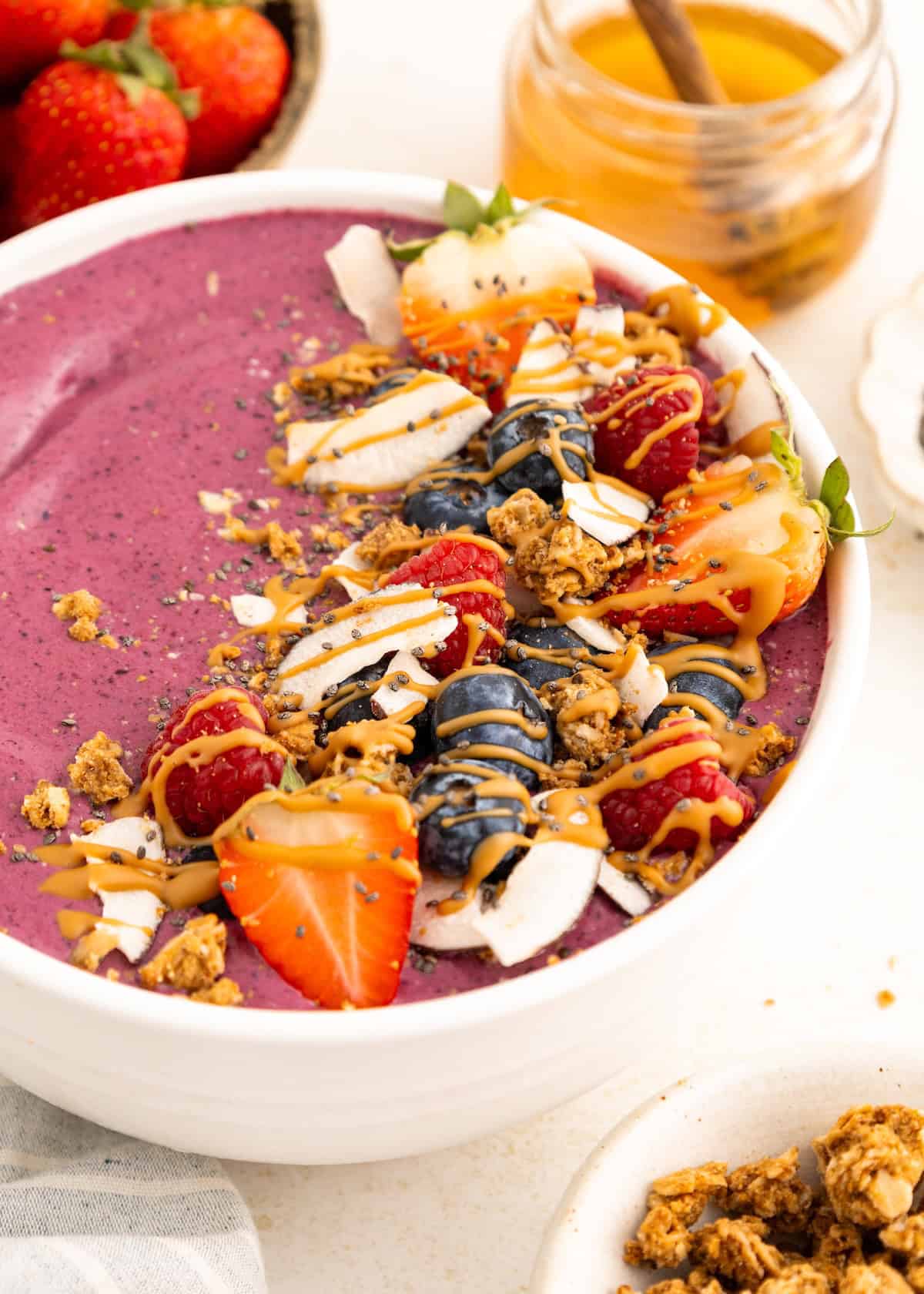 🥣 Main Ingredients: Frozen mixed berries, whole milk Greek yogurt, milk, protein powder, almond butter, açaí powder