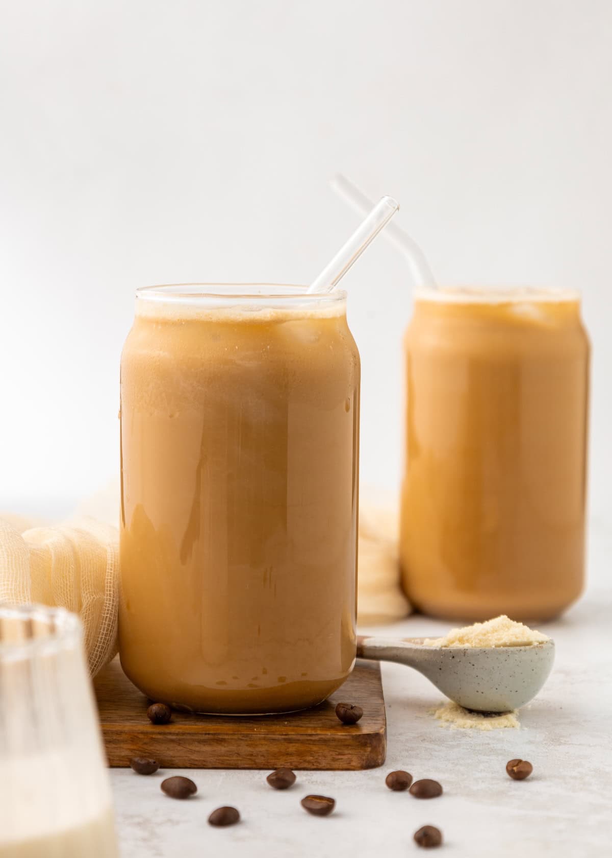 Whey, plant based, or collagen protein powders can all work for protein iced coffee, though finely ground powders tend to dissolve more smoothly.