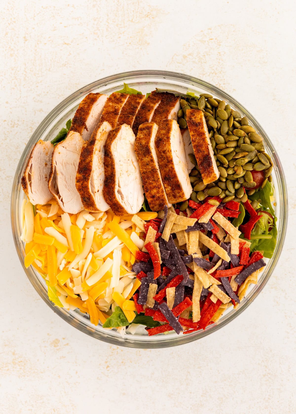 - Step 2: Top with the sliced grilled chicken, shredded cheese, pepitas, and tortilla strips. Toss with your favorite dressing just before serving, or serve the dressing on the side.